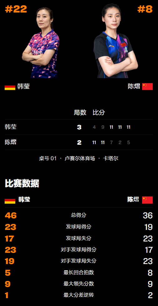 去年两位运动员有过2次交手,陈熠先以3-0速胜,但随后1-3不敌对方,被韩莹的削球变化打乱,最后一局甚至只拿到2分就崩盘,如今再次相遇需做足困难的准备。